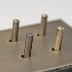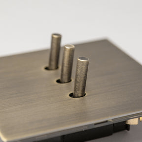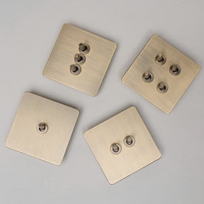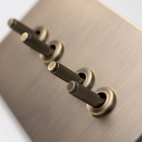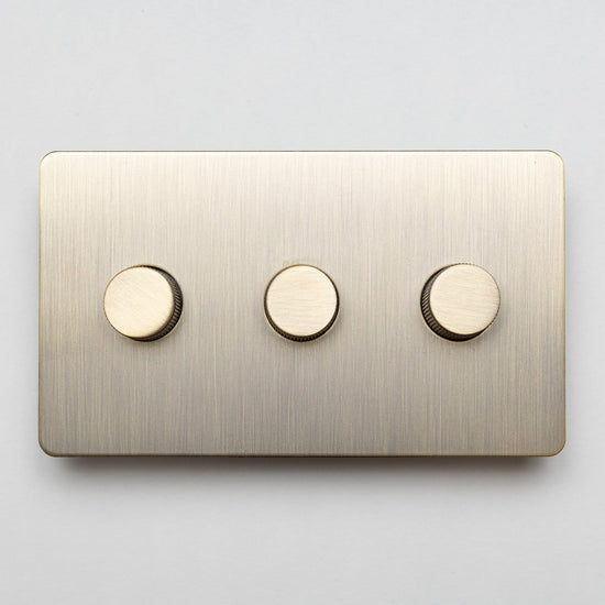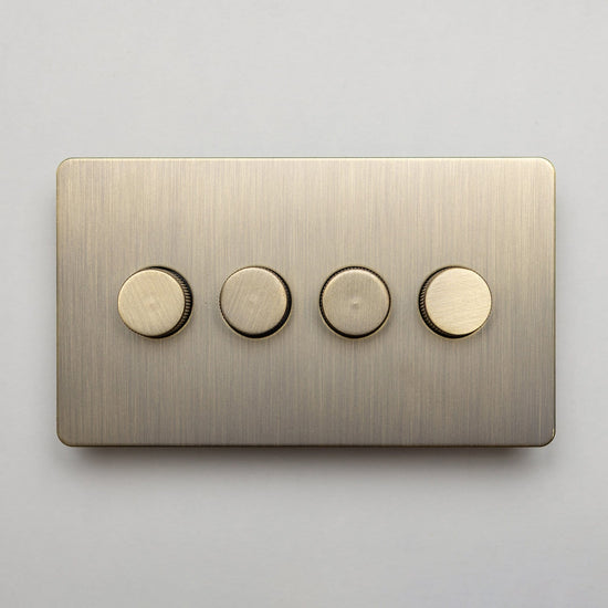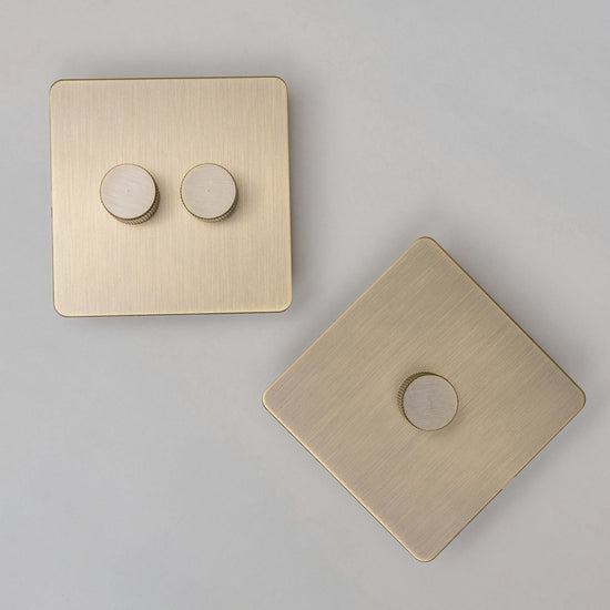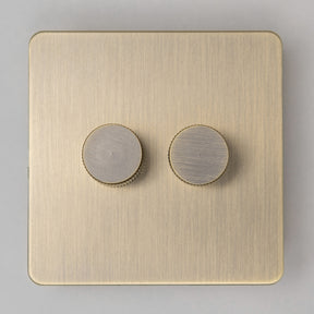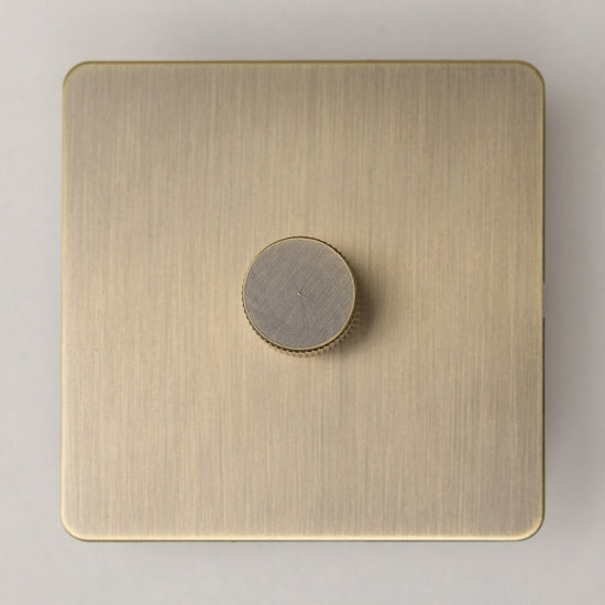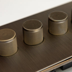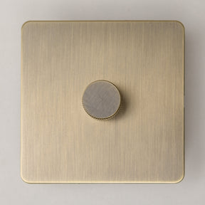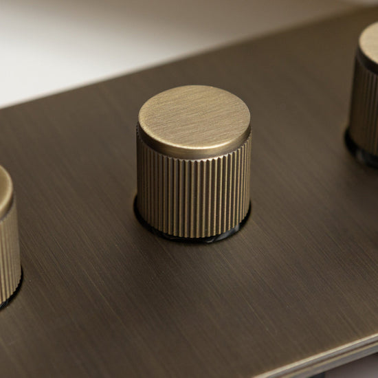 This collection is the epitome of understated luxury, perfect for those who value design as much as functionality. The antique brass finish resists fingerprints and tarnishing, ensuring a pristine look for years to come. The knurled detailing on the dimmer switches adds a contemporary twist, making each piece a true statement.