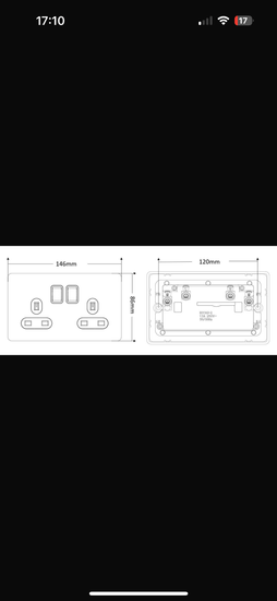 | Double 13A Switched Socket | 146mm x 88mm - screw hole distance 120mm |