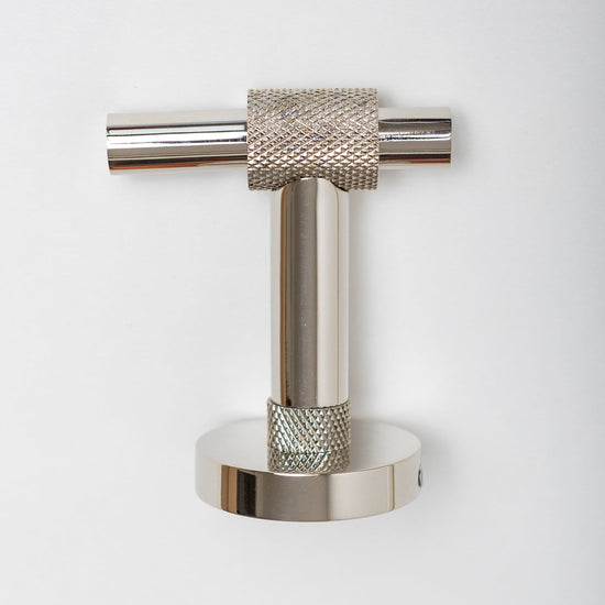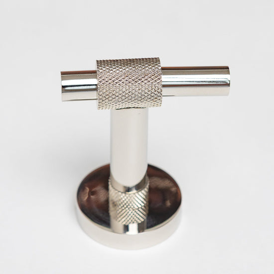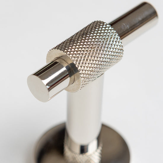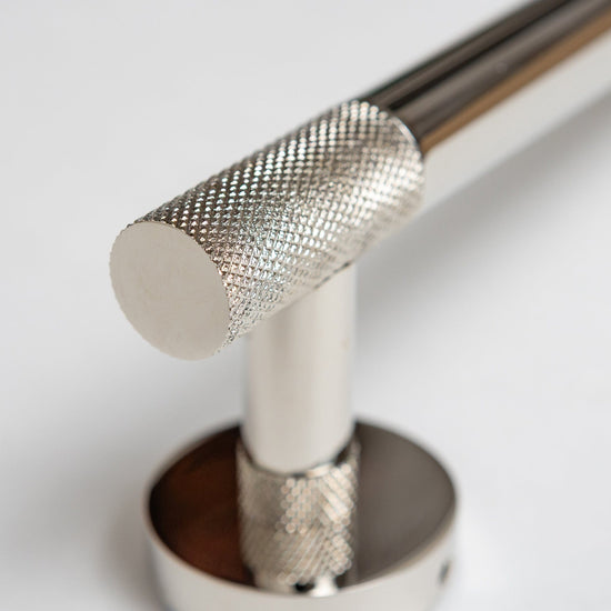Each piece is crafted from premium stainless steel and finished in a Nickel coating, offering durability and resistance to moisture and wear. The distinctive knurled texture adds a tactile, architectural detail that enhances grip while providing a bold, contemporary aesthetic.