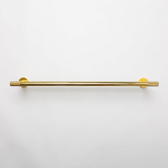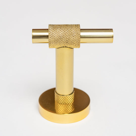 Each piece is crafted from premium stainless steel and finished in a Brass coating, offering durability and resistance to moisture and wear. The distinctive knurled texture adds a tactile, architectural detail that enhances grip while providing a bold, contemporary aesthetic.