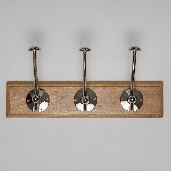 Wooden Hook Rack - 3 x Mushroom Coat Hook - Nickel Finish
