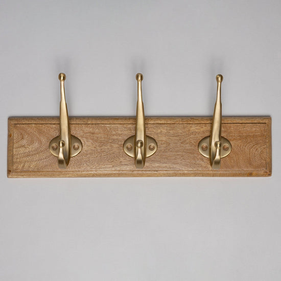 Wooden Hook Rack - 3 x Oval Coat Hook - Satin Brass Finish